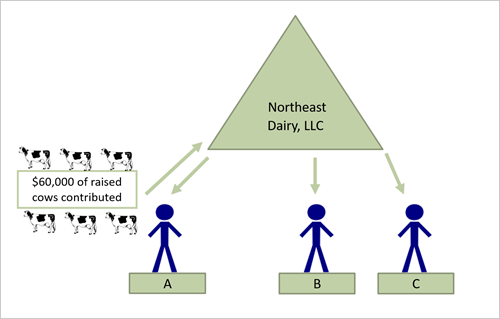 If “A” contributes 60 raised cows into the LLC, the tax rules require that all of the “built in gain” be taxed to the contributor, “A”. This rule is not new, but the ongoing tracking of that built in gain for the tax return is new. If those 60 cows were worth $60,000 and, in the year they are contributed, 20 are sold, then $20,000 is taxed to the contributor regardless of how profits and losses are split.