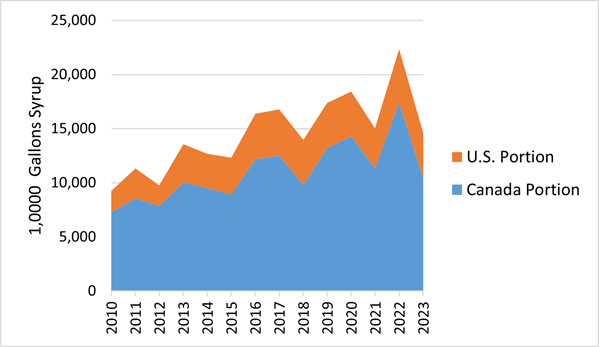Figure 1: Combined North American maple syrup production from 2010-2023 (Sources: USDA National Agricultural Statistics Service and Statistique Canada).